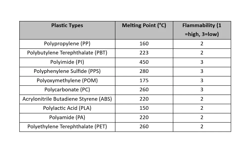 Additionally, melting points and flammability are important to plastic material properties. This table outlines the melting point and ranks the flammability of 10 widely used plastics.