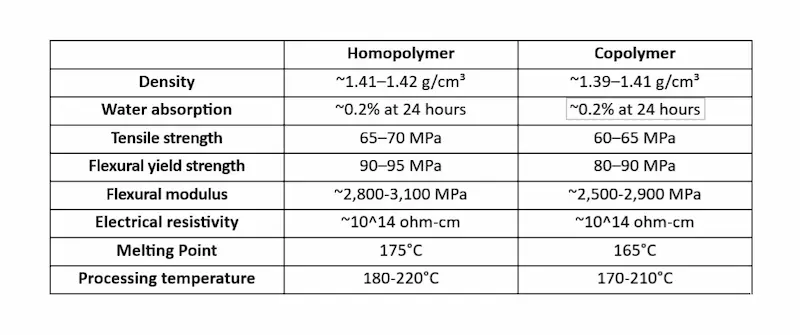 Although POM resin uses both homopolymers and copolymers and they are functionally the same, some of their key properties and performance slightly differ.