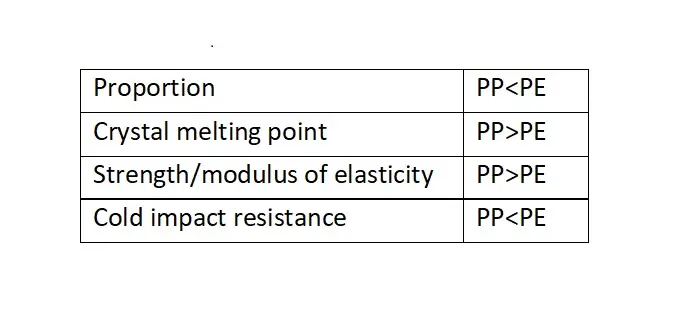 Though PP has properties similar to PE, it has better mechanical properties, and the melting temperature of polypropylene (crystalline melting point) is higher. Here’s a comparison of