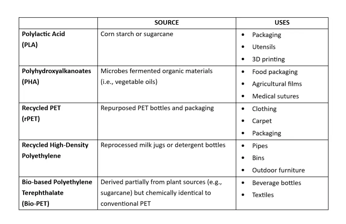 Sustainable plastics examples include:
