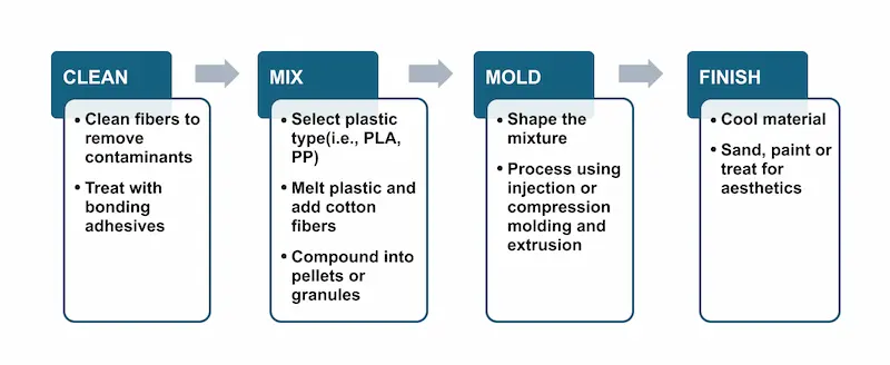 Cotton plastic is a hybrid material that blends natural cotton fibers with melted plastic polymers using the following process: