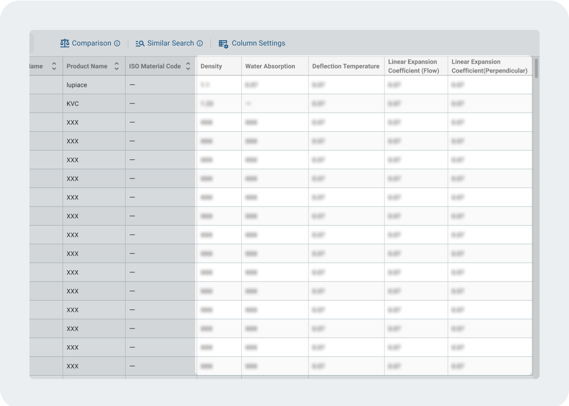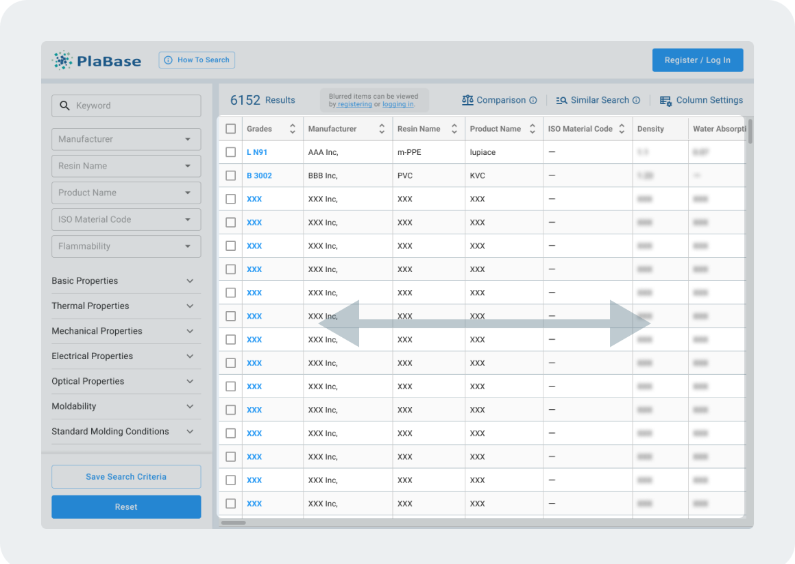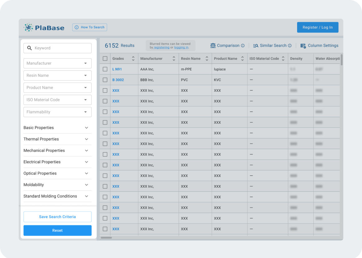 PlaBase offers industry experts and engineers an easy way to search and compare plastic and resin molding materials. Using this integrated database, you can search over 6,000 materials to find those that most suit your needs. It has a wide range of functions to filter and compare detailed specifications, including material usage, processing method, suppliers and more.