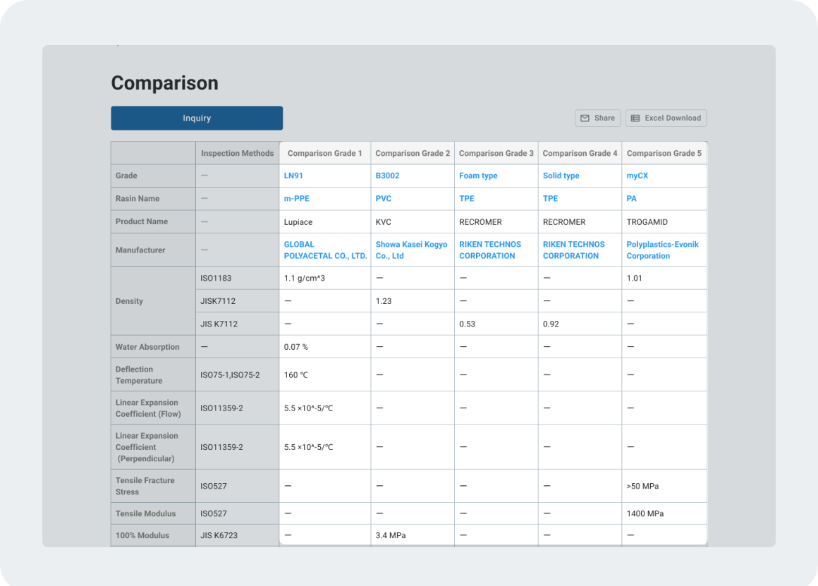 Select up to five (5) materials from your search results to create a customized, direct comparison. The easy-to-read format lets you evaluate each plastic's inspection method, grade, properties and strength.