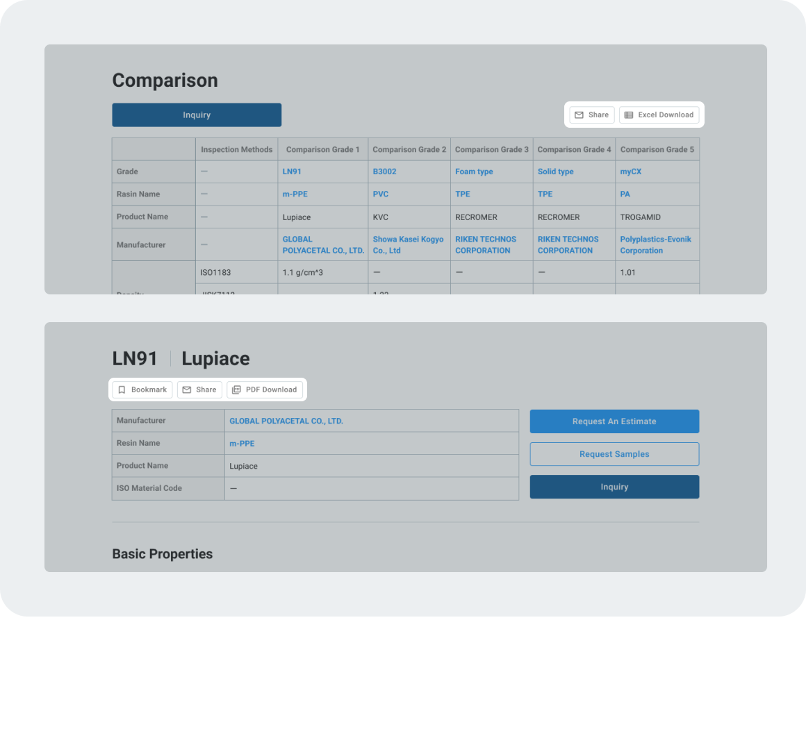 PlaBase allows you to easily share plastic molding material data with your colleagues via web pages or by downloading Microsoft Excel documents.